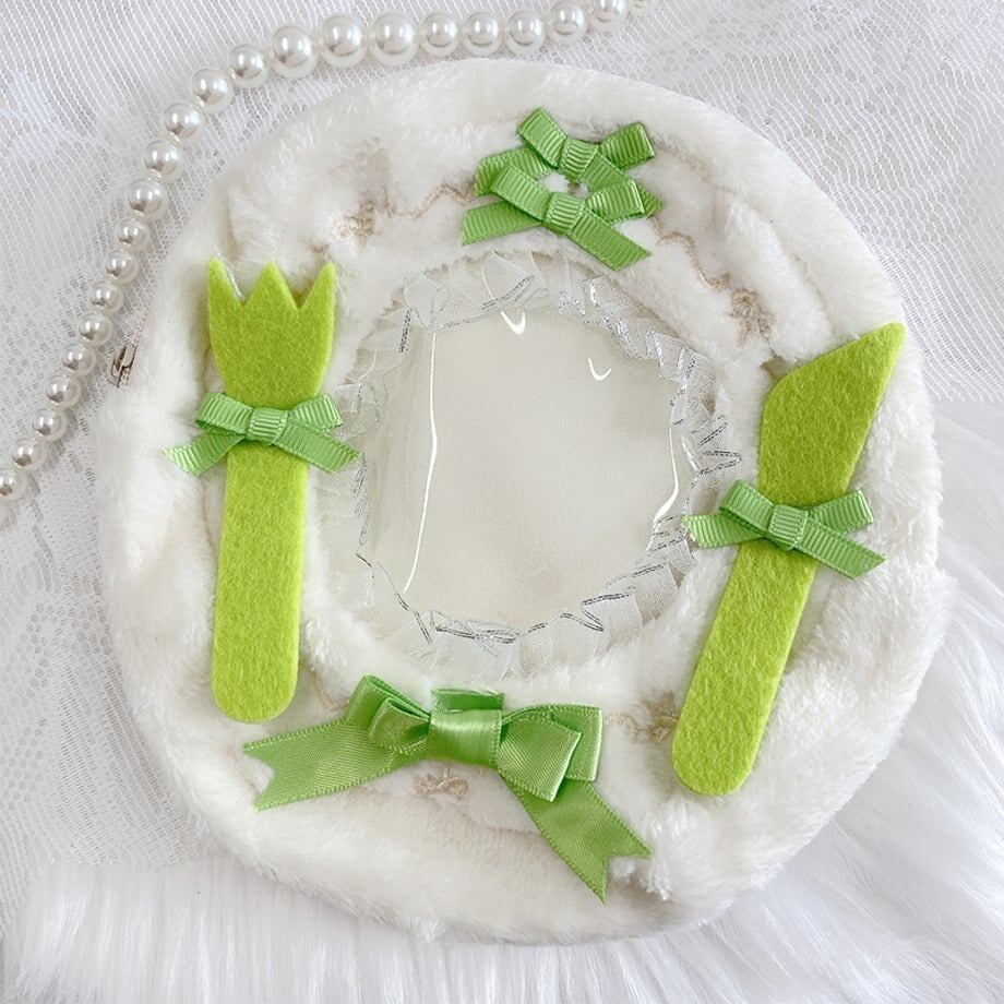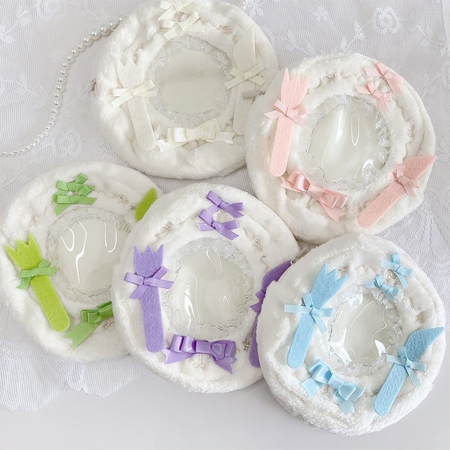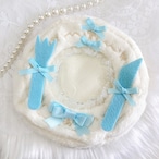 もこもこの白いボア生地に柄が刺繍されており、ナイフとフォーク、リボンの装飾が付いています。