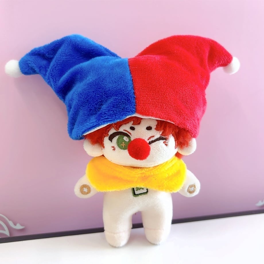 赤と青のツートンカラーの帽子、愛嬌たっぷりの赤い鼻、そして首元を華やかに飾るフリル衿。それぞれのアイテムがピエロの個性を際立たせ、ぬいぐるみに新たな表情を与えます。