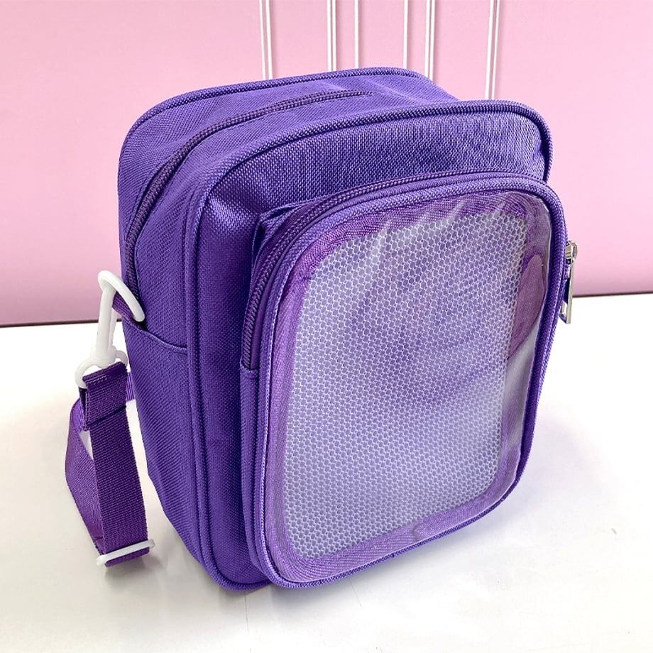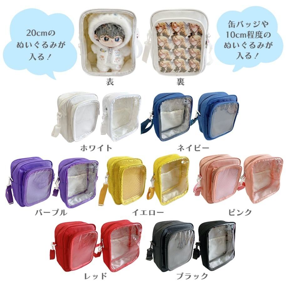 「裏」側: 缶バッジをぎっしり飾ったり、10cm程度の小さなぬいぐるみを入れたりできるクリアポケット。イベントや気分に合わせて、ディスプレイをチェンジ!その日の気分や推し活の内容に合わせて、見せる「推し」を両面で使い分けられます。