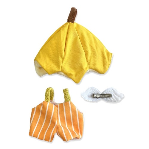 バナナの帽子、オーバーオール、そして天使の羽の飾りがセットになっているので、これ一つで全身のコーディネートが完成します。