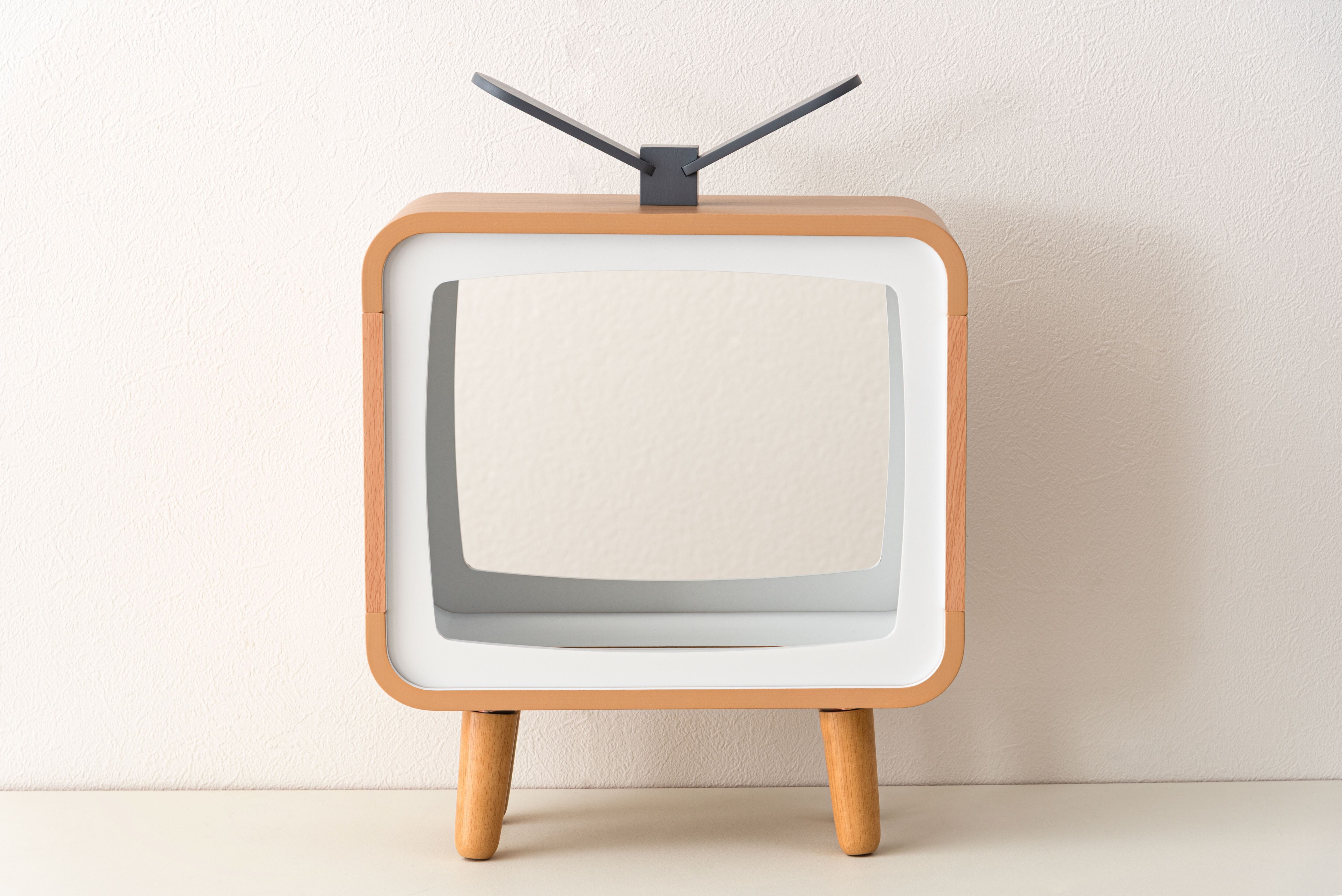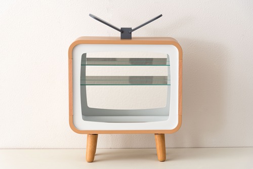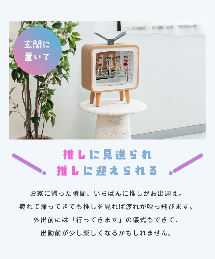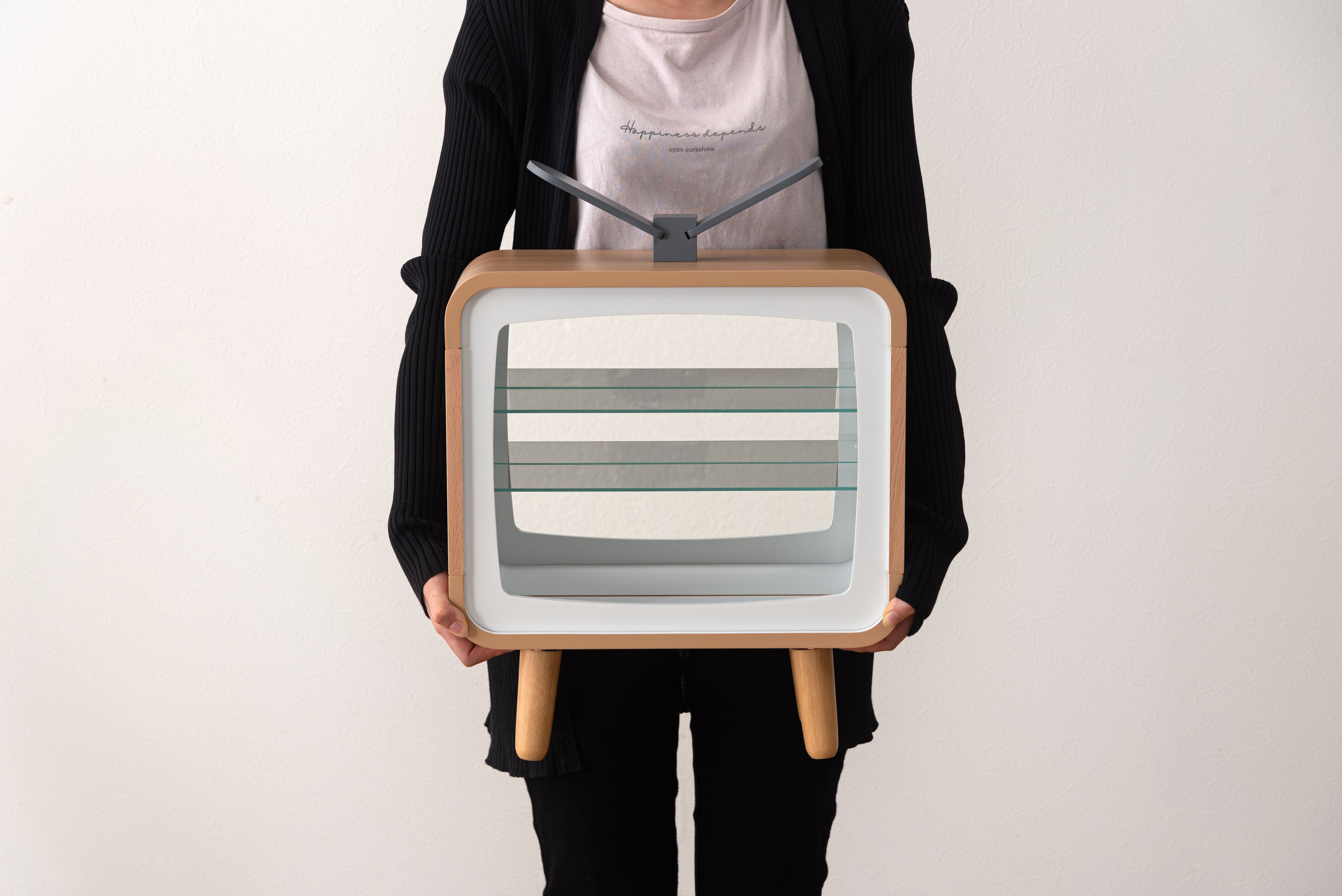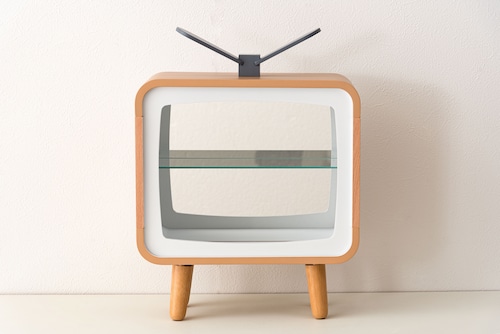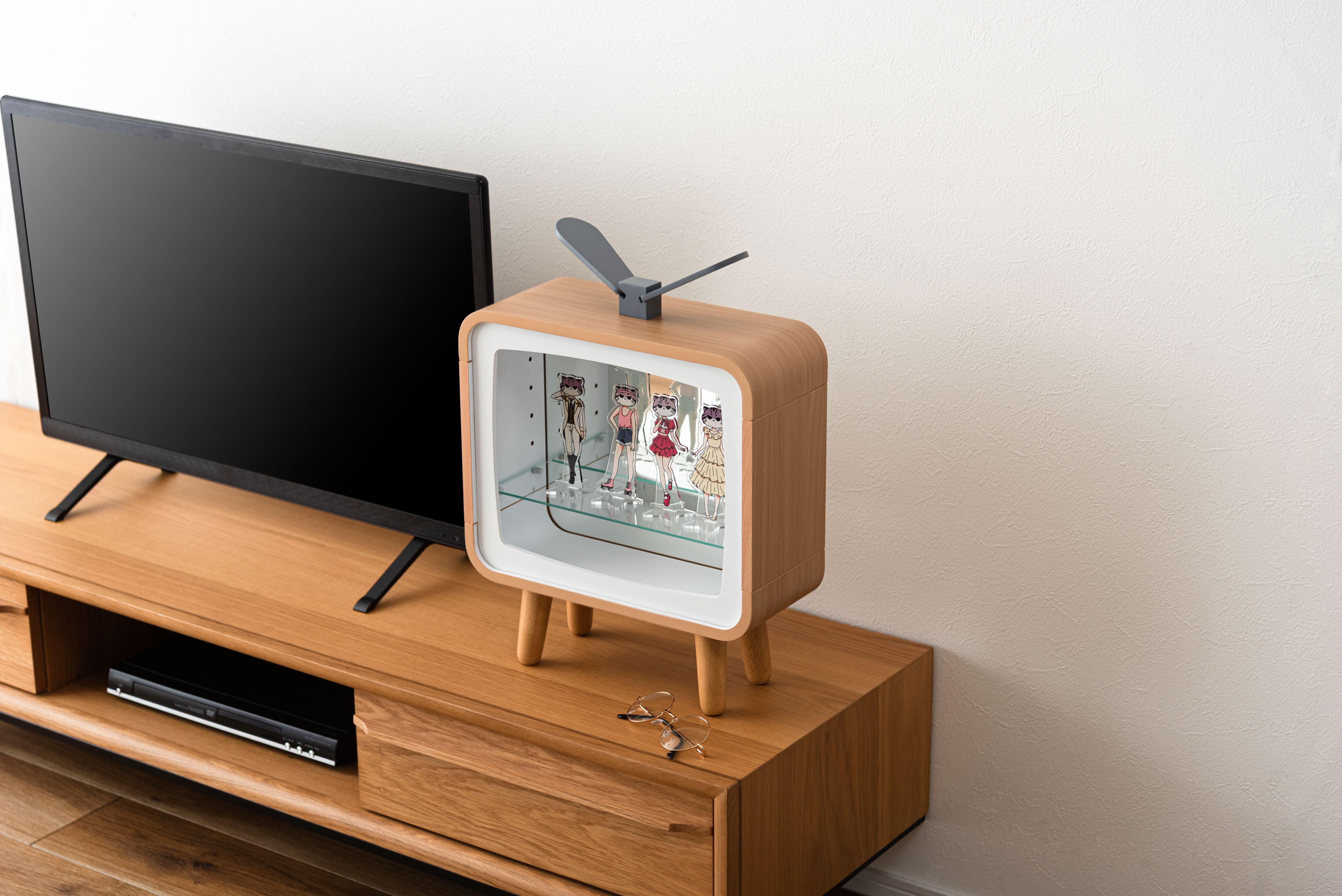 "昭和のレトロテレビをモチーフにしたかわいらしいコレクションラック。
