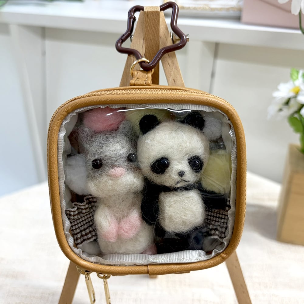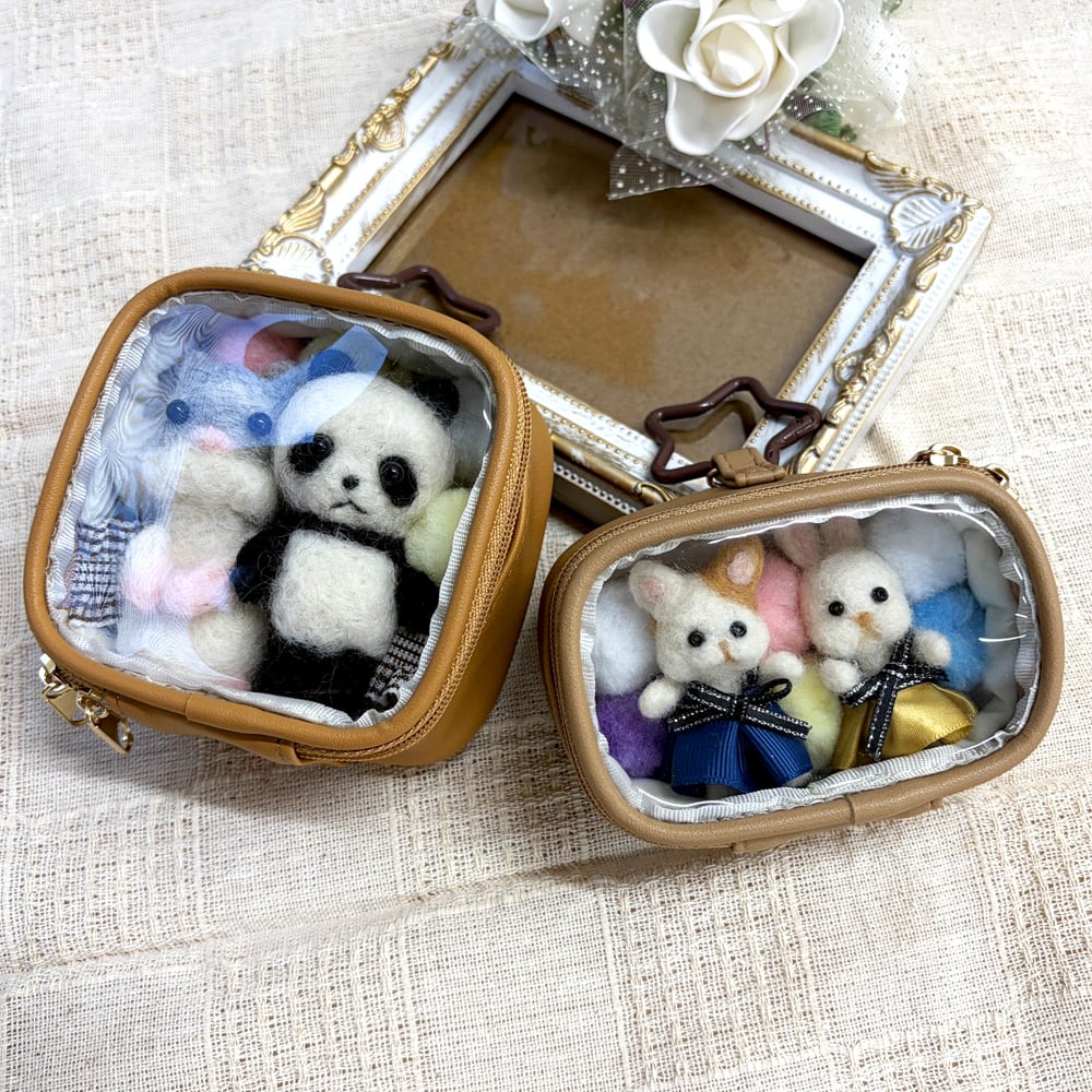 カプセルトイフィギュアやフロッキーマスコットなど、小さいサイズのお人形を複数収納して持ち歩ける小さいポーチです。