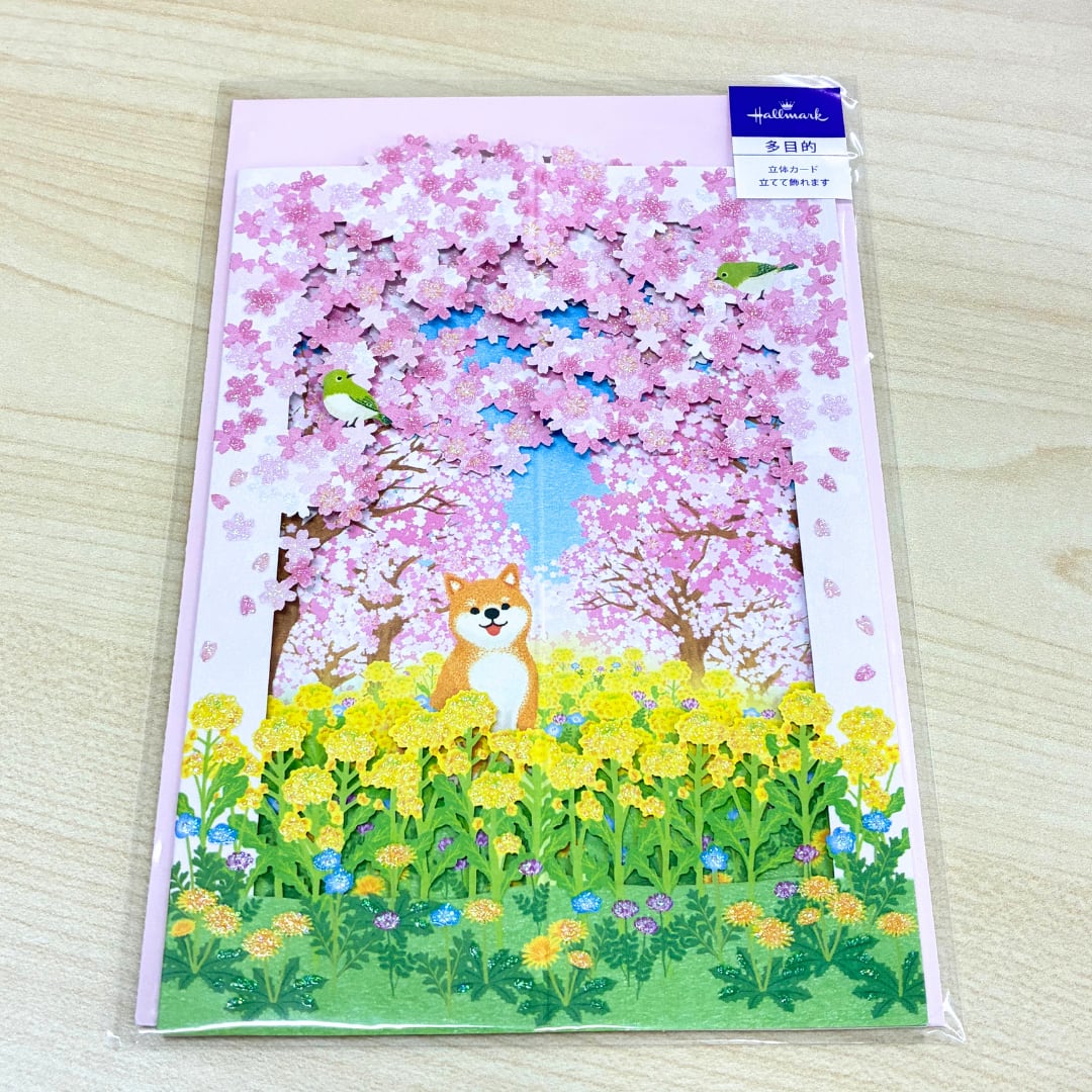 空いっぱいに広がる桜の花と辺り一面に咲く菜の花をいきいきと描いた春柄立体カードです。可愛らしいメジロと柴犬がポイント!