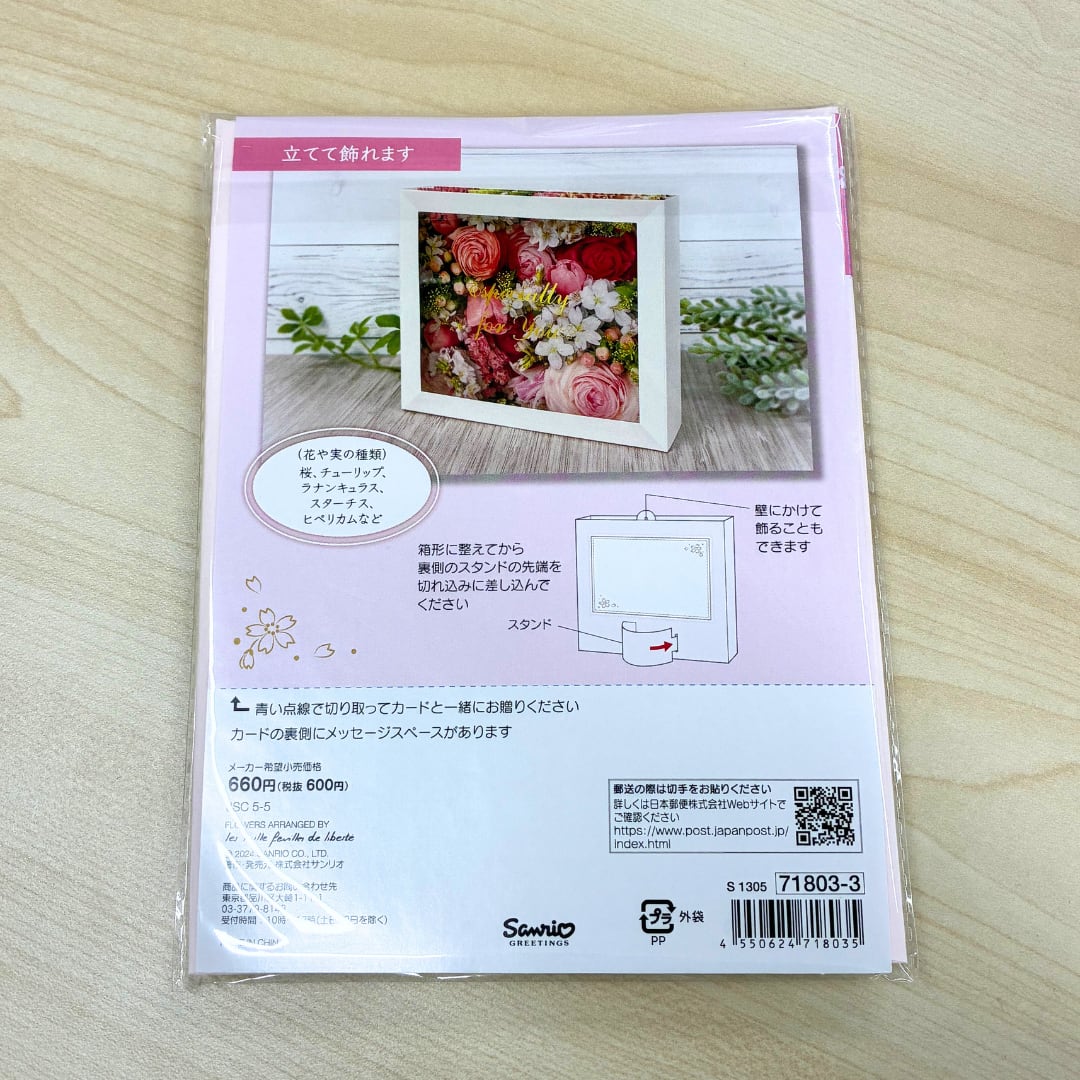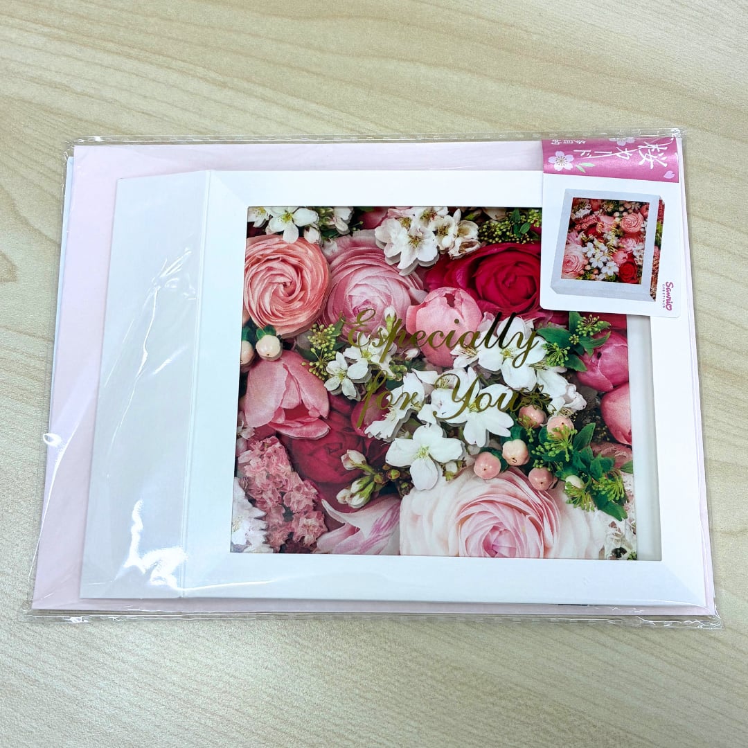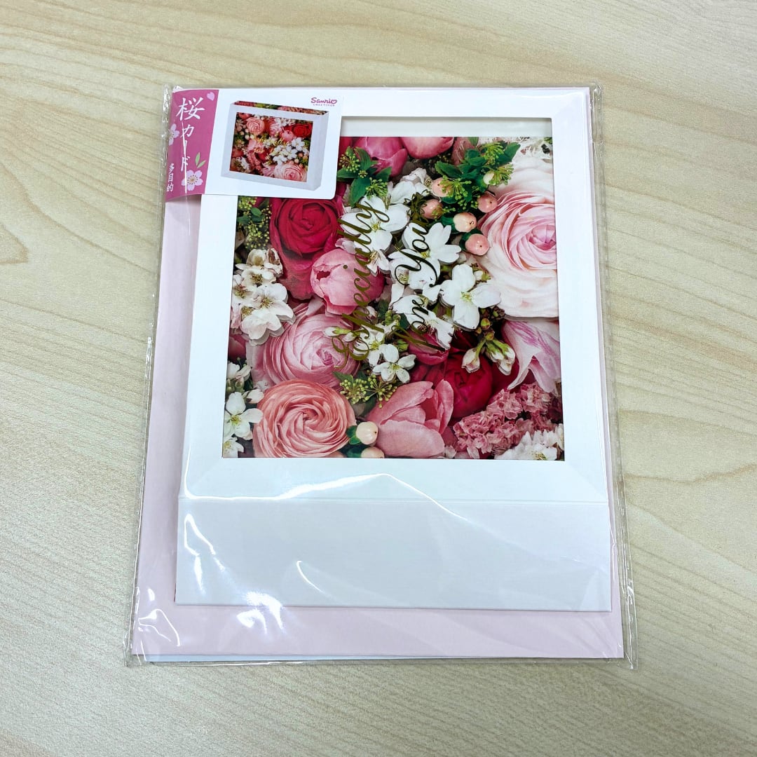 税込実際に桜やチューリップなどを敷き詰めたアレンジメントを写真に撮り、3層に重ねて立体感を出した、フラワーボックスのようなカードです。
