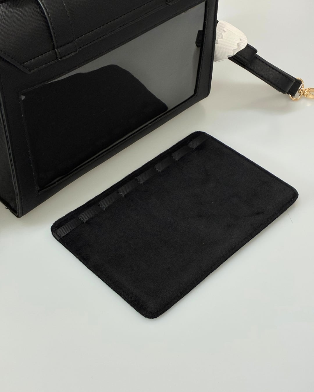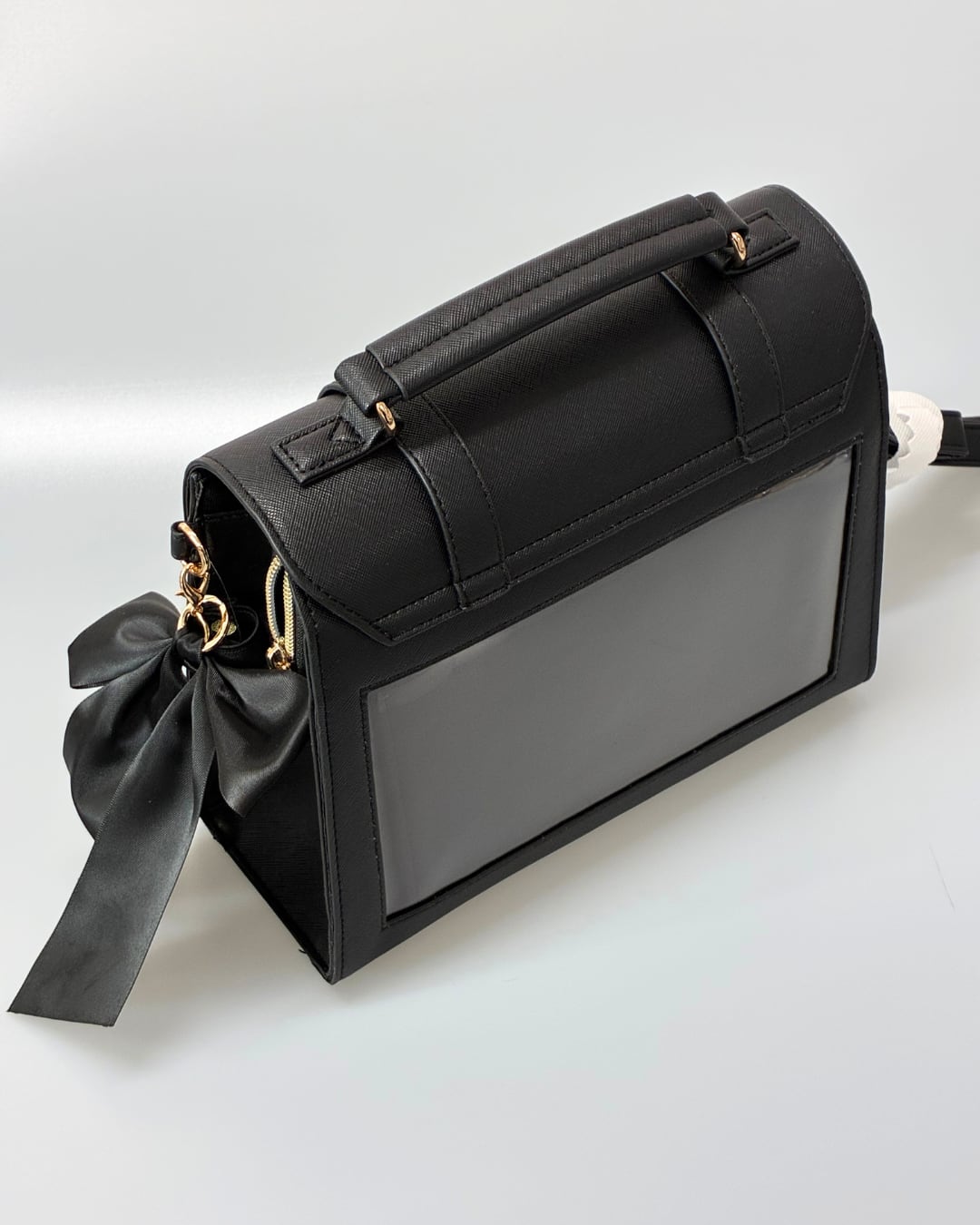 バッグの後ろ側には板が入っており、お気に入りのグッズを見せながら持ち運べます。