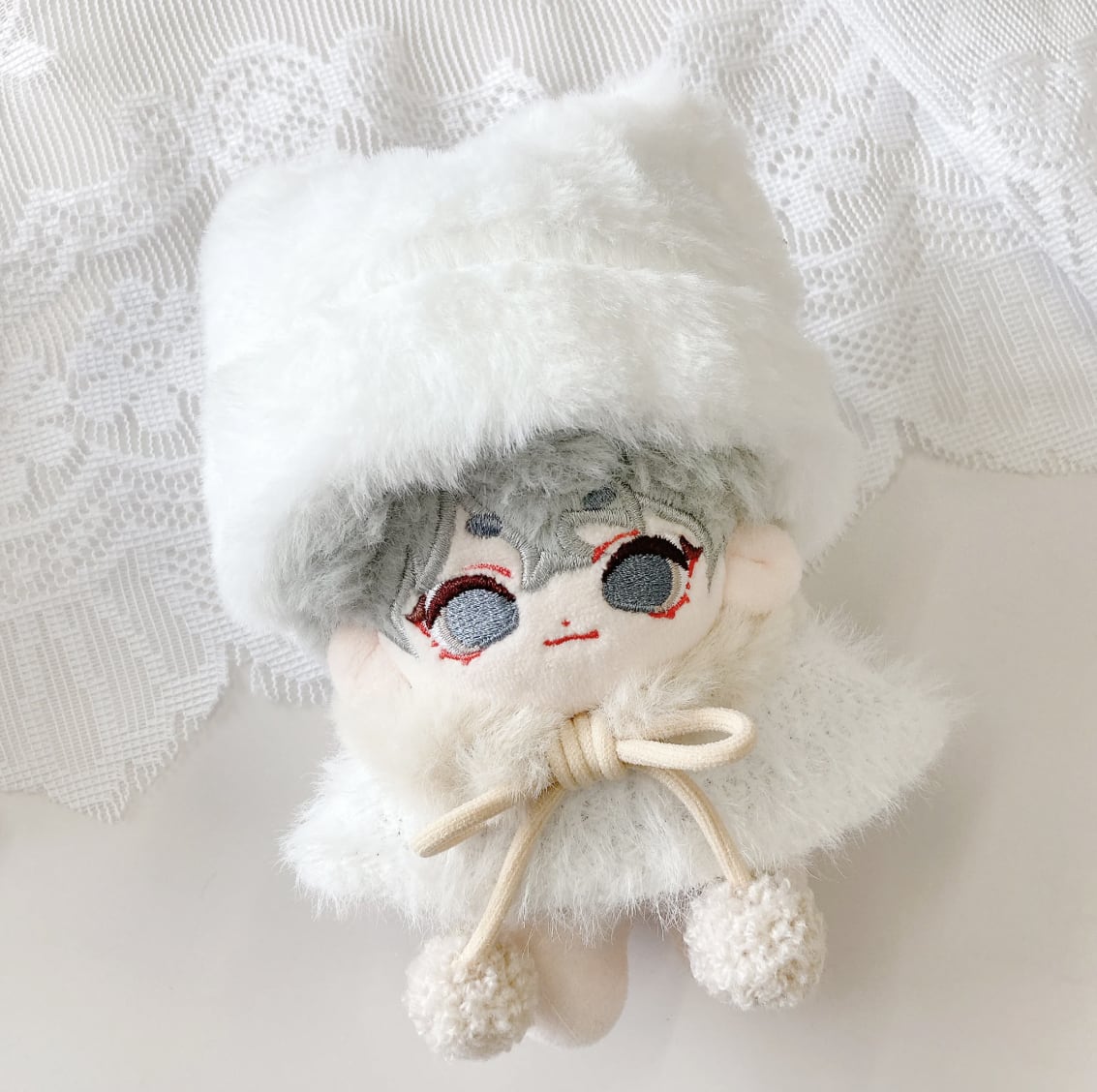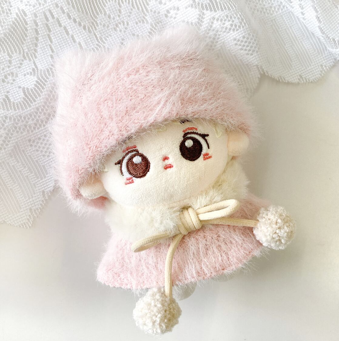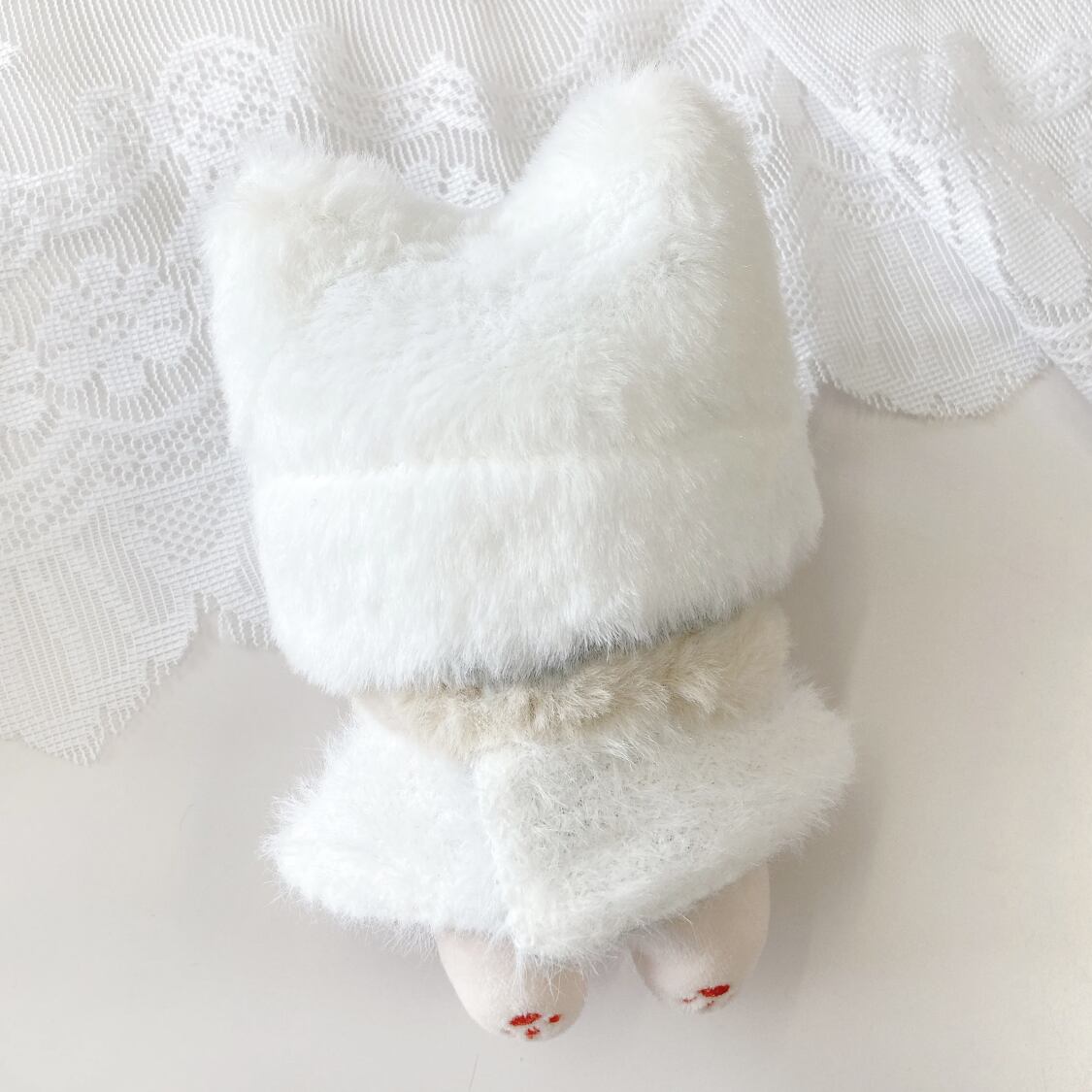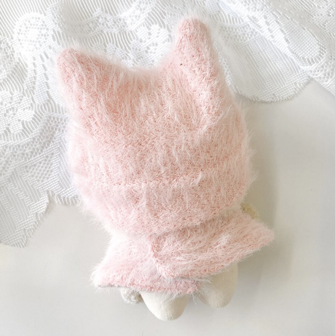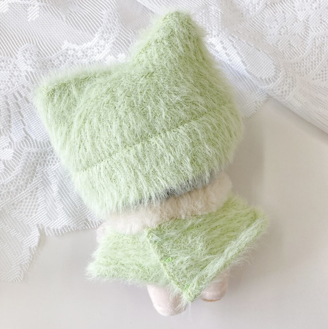 10cmサイズのぬいぐるみ用の猫耳ニット帽と、ファーポンチョ・マフラーの3点セットです。
