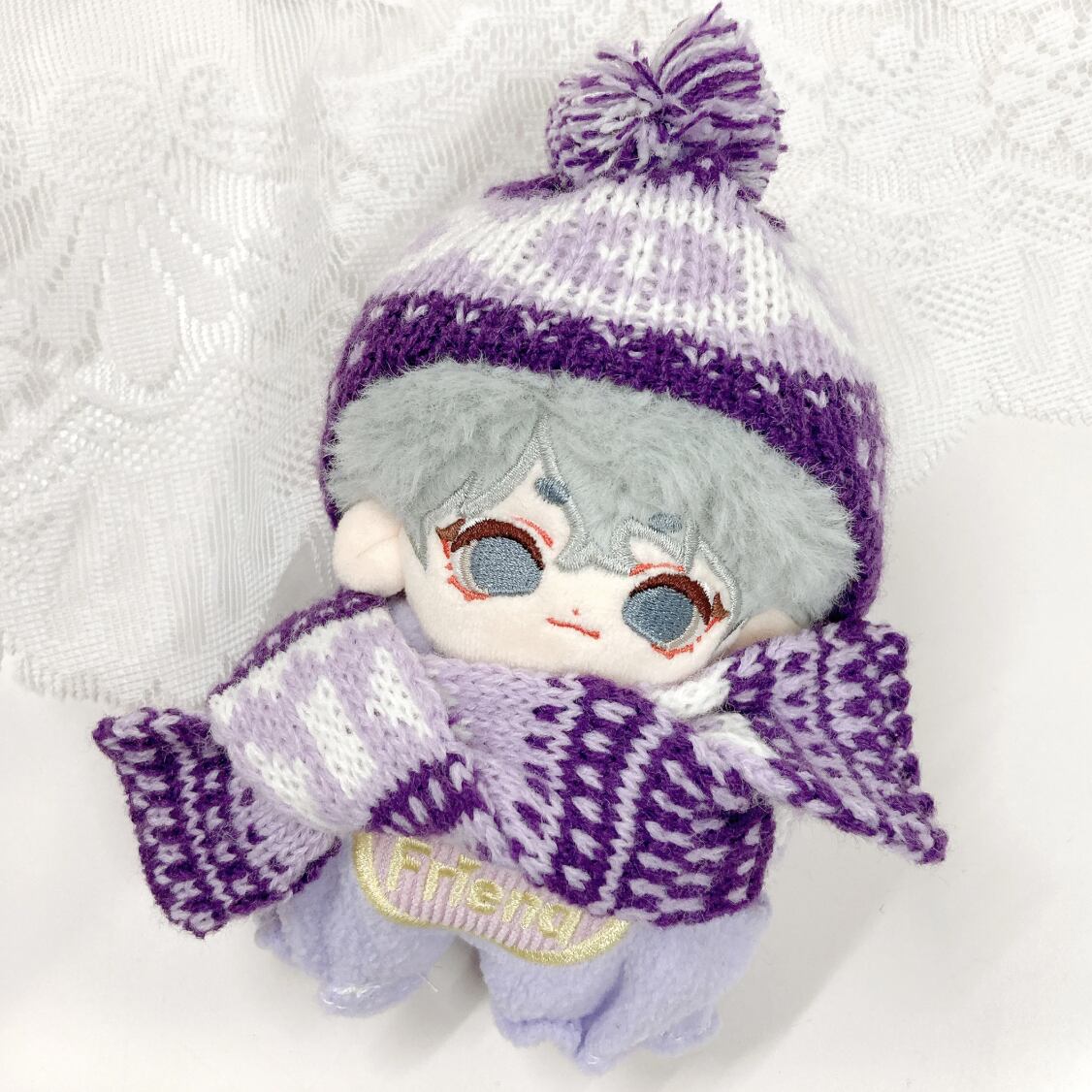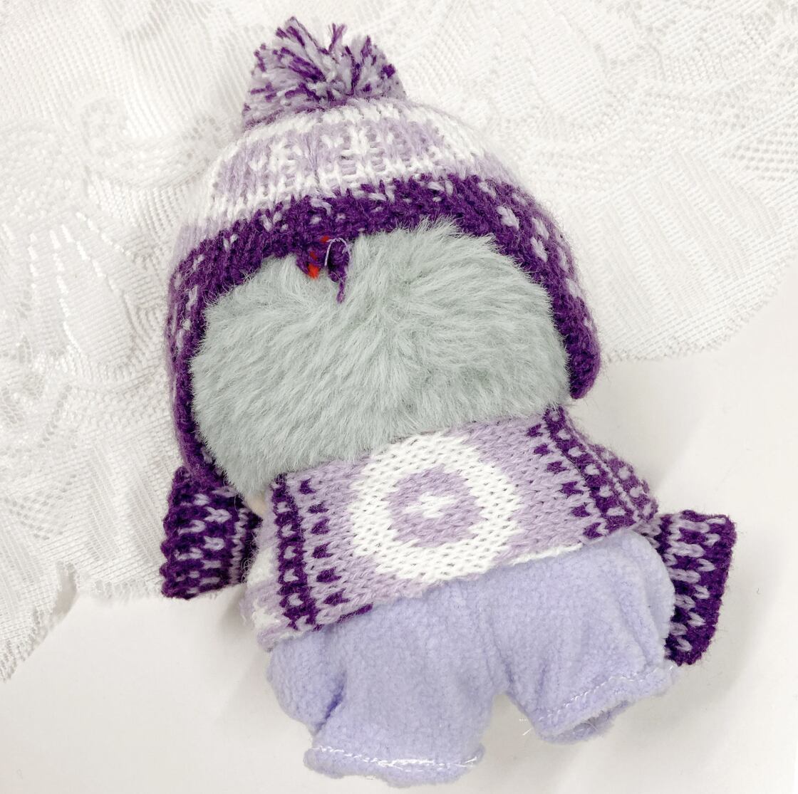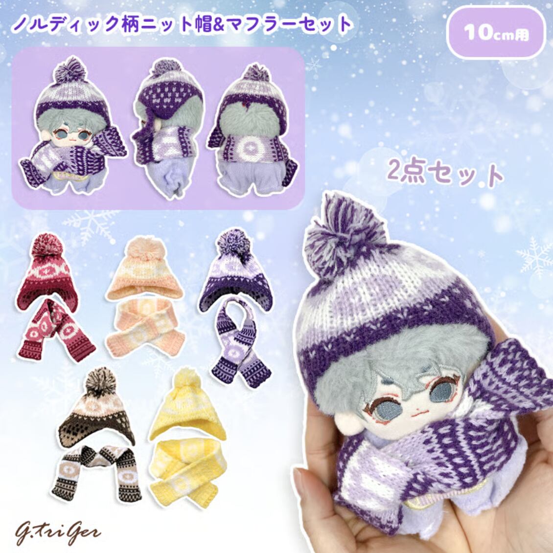 10cmサイズのぬいぐるみ用のノルディック柄ニット帽とマフラーの2点セットです。 温かみのある北欧風の編み模様と、トップの大きなポンポンが目を引くデザイン。耳までしっかり隠れる形のニット帽と、お揃いの柄のマフラーを組み合わせることで、ぬいぐるみを冬のお出かけにぴったりな、ぬくもりあふれるスタイルに変身させます。豊富な5色のカラーバリエーションで、推しカラーに合わせた冬の「ぬい撮り」を存分に楽しめるアイテムです。