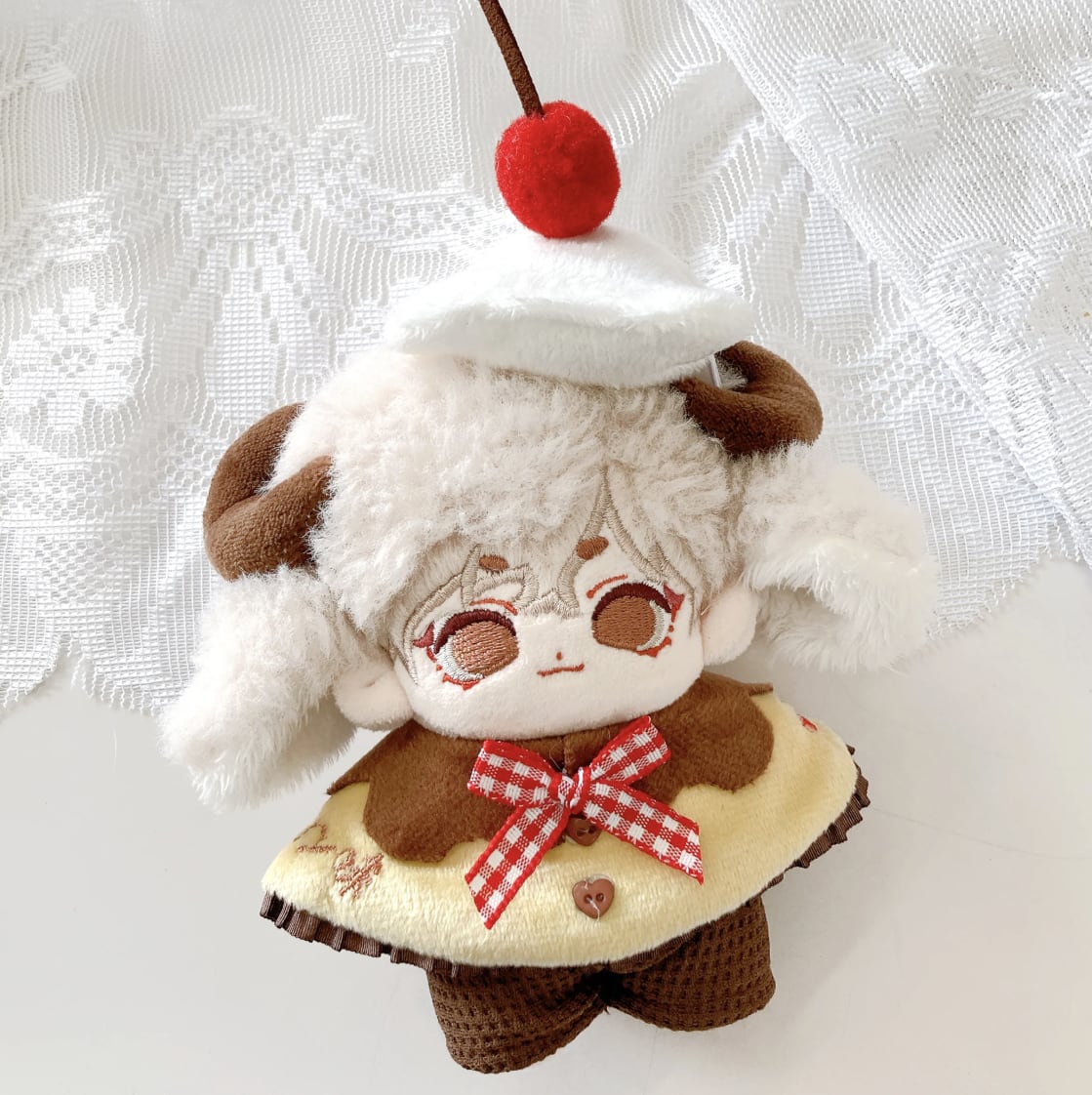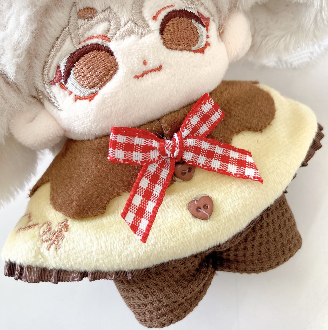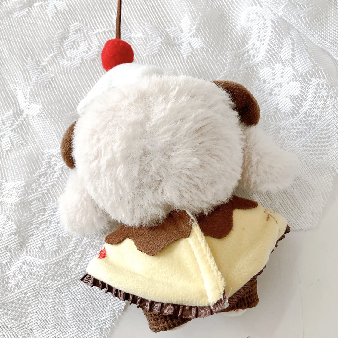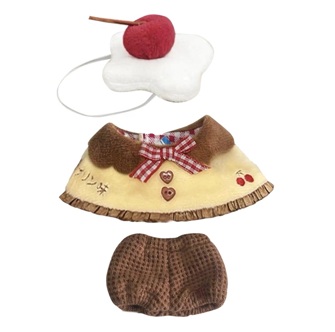 カラメルソースをイメージした茶色の襟付きポンチョと、ホイップクリームにさくらんぼが乗ったヘッドドレスを組み合わせることで、ぬいぐるみが美味しそうなプリンに変身します。