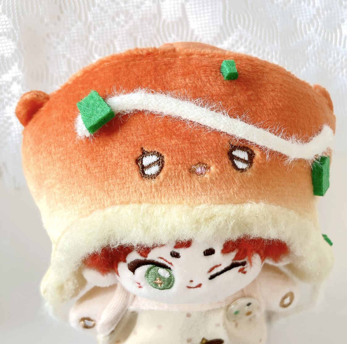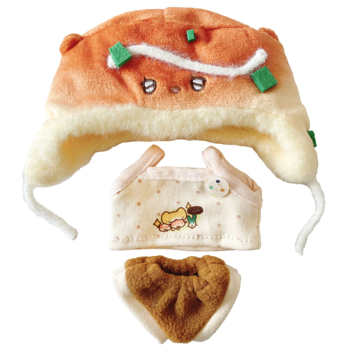 ボリュームたっぷりの帽子は、被せるだけでぬいぐるみが愛らしいキャラクターに大変身します。トップスの胸元にはたこ焼きやフルーツのキュートなイラストが施され、袖を通すだけでワクワクするようなデザイン。