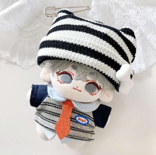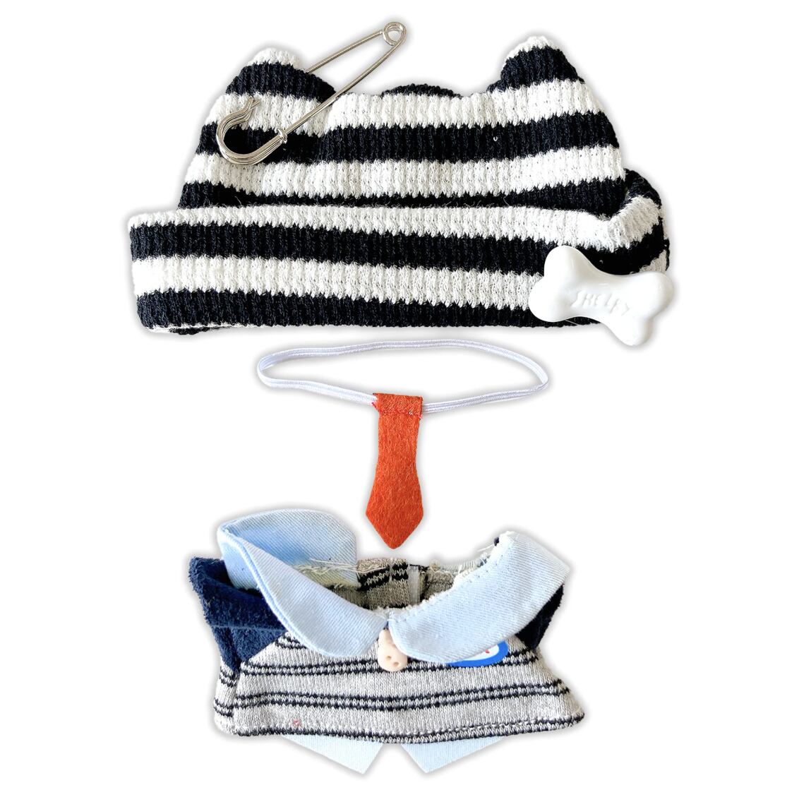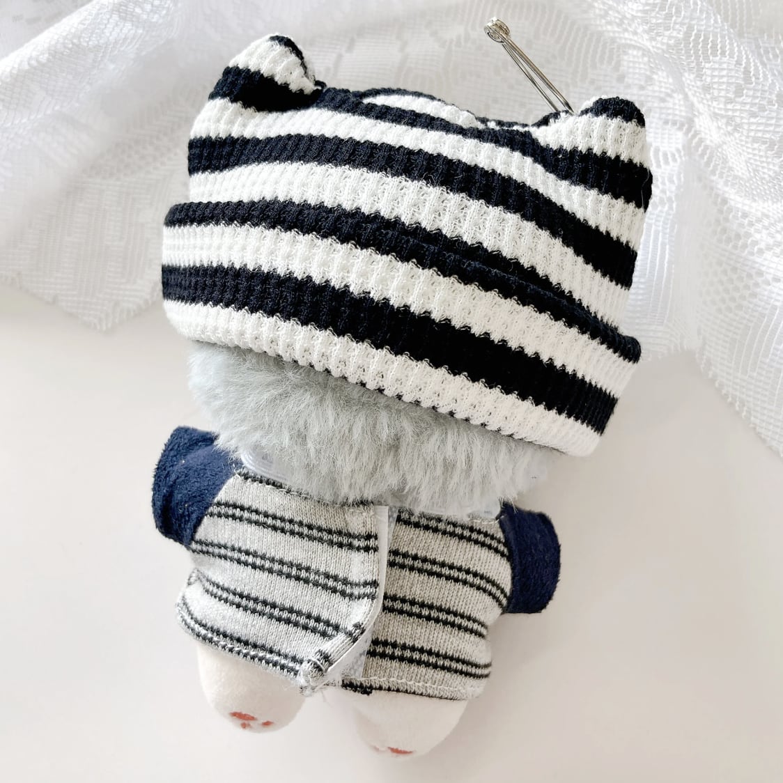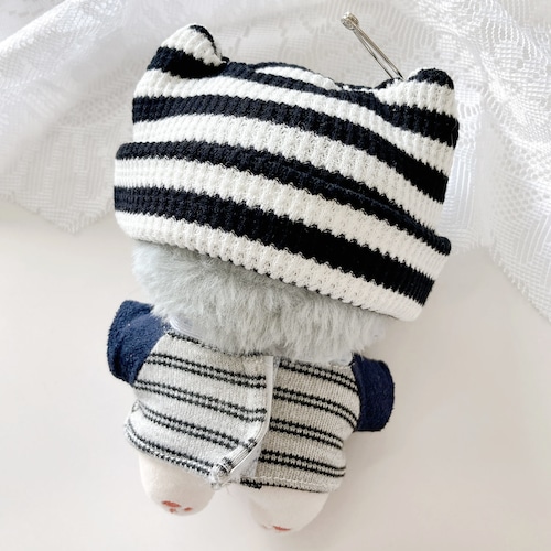 10cmサイズのぬいぐるみ用のボーダー柄猫耳ニット帽とトップスのカジュアルな2点セットです。