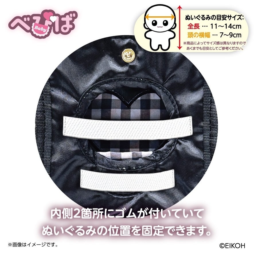 内側2箇所にゴムが付いていてぬいぐるみの位置を固定できます。