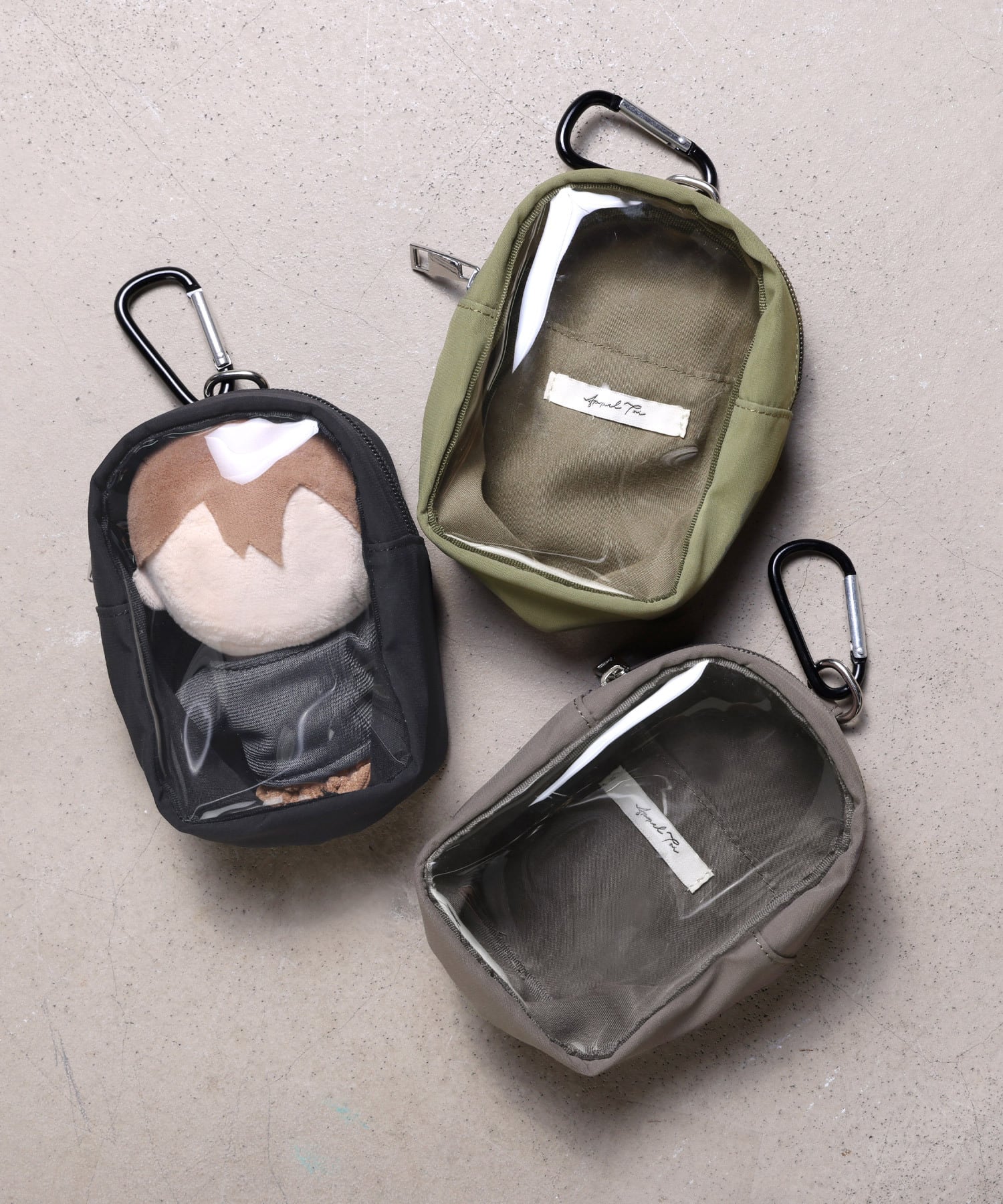 カラビナ付きでバッグやリュックにさっと取り付けられるぬいポーチです。