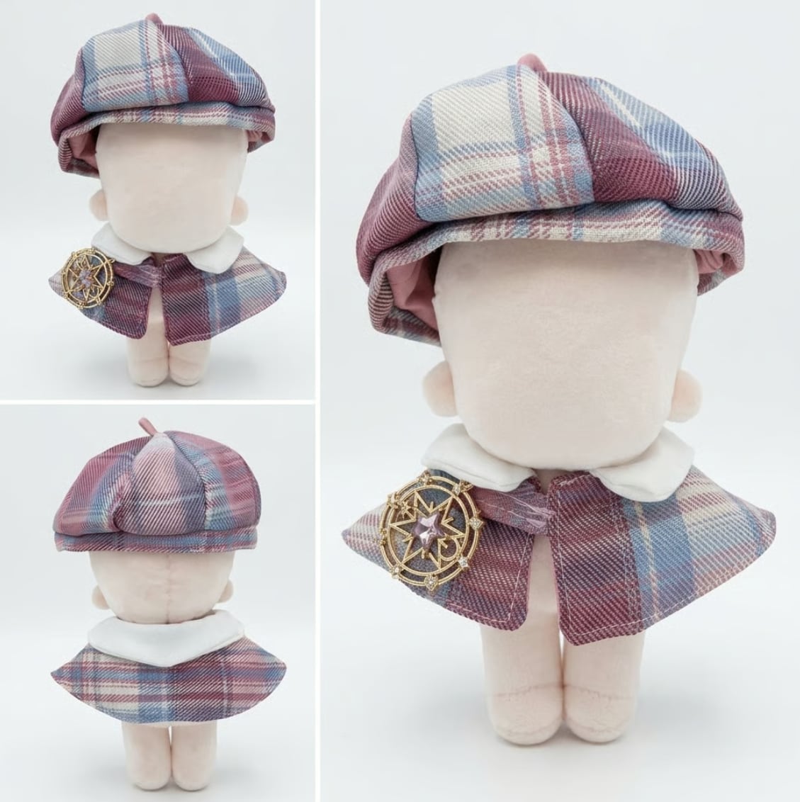 シックなチェック柄のベレー帽と、胸元の星型ブローチが輝くポンチョの豪華2点セットです。