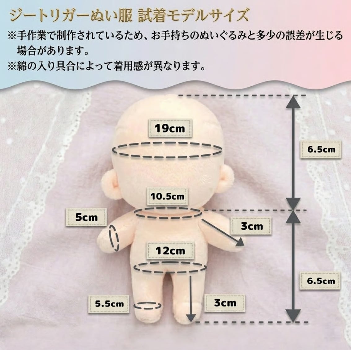 商品に使用されているぬいぐるみのサイズは目安です。お手持ちのぬいぐるみの寸法をご確認ください。