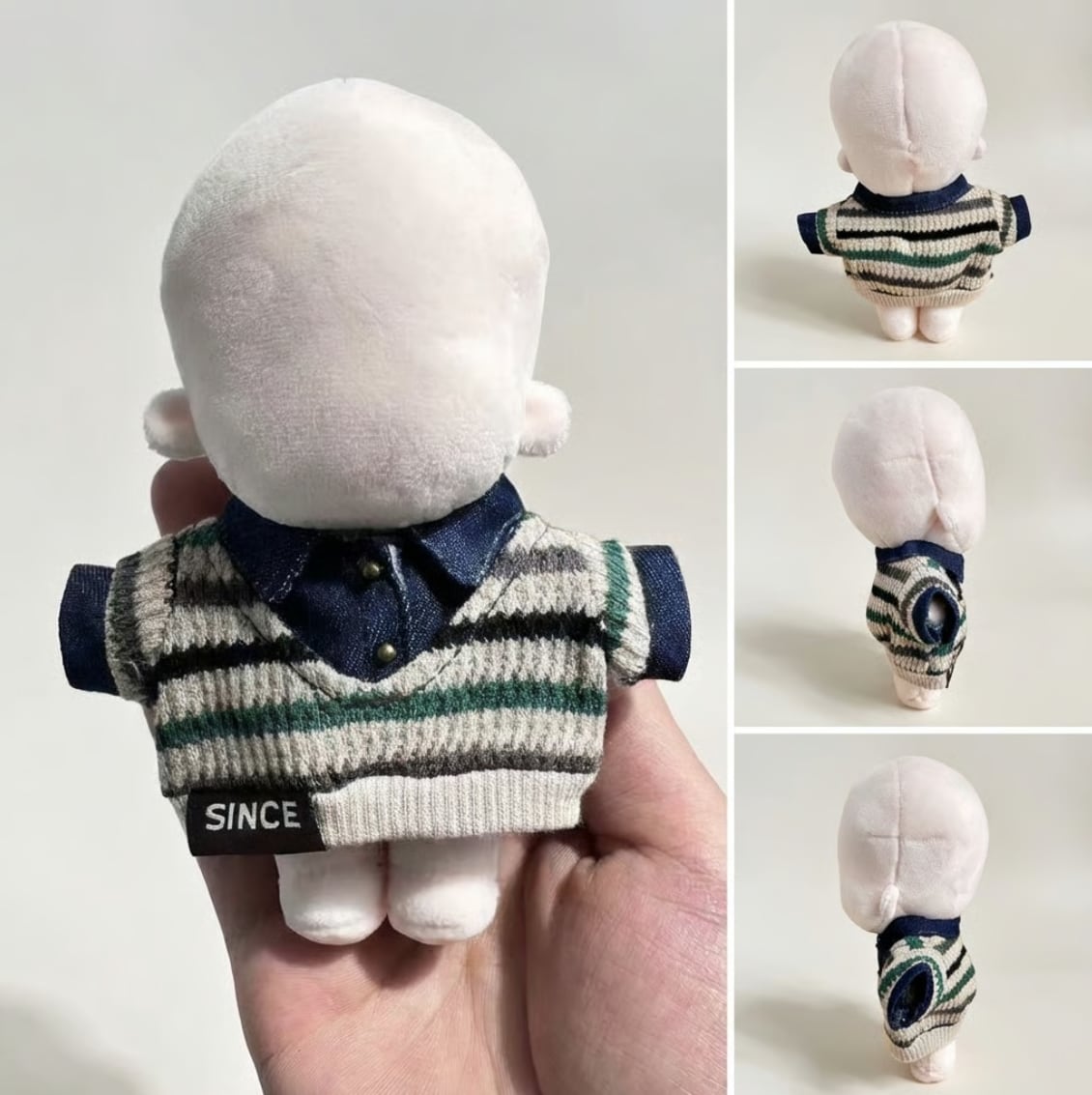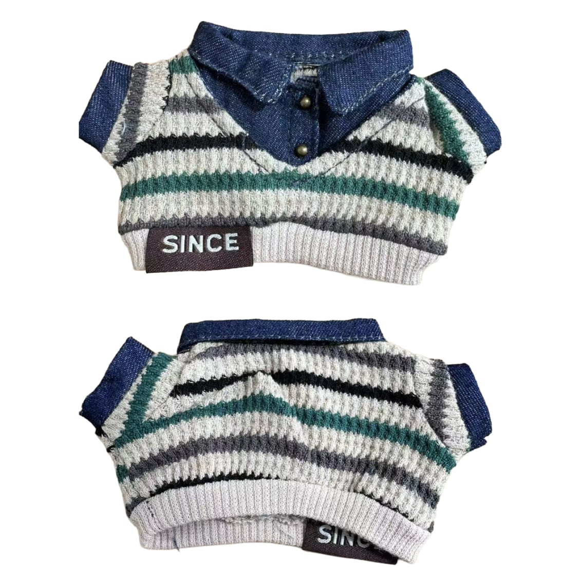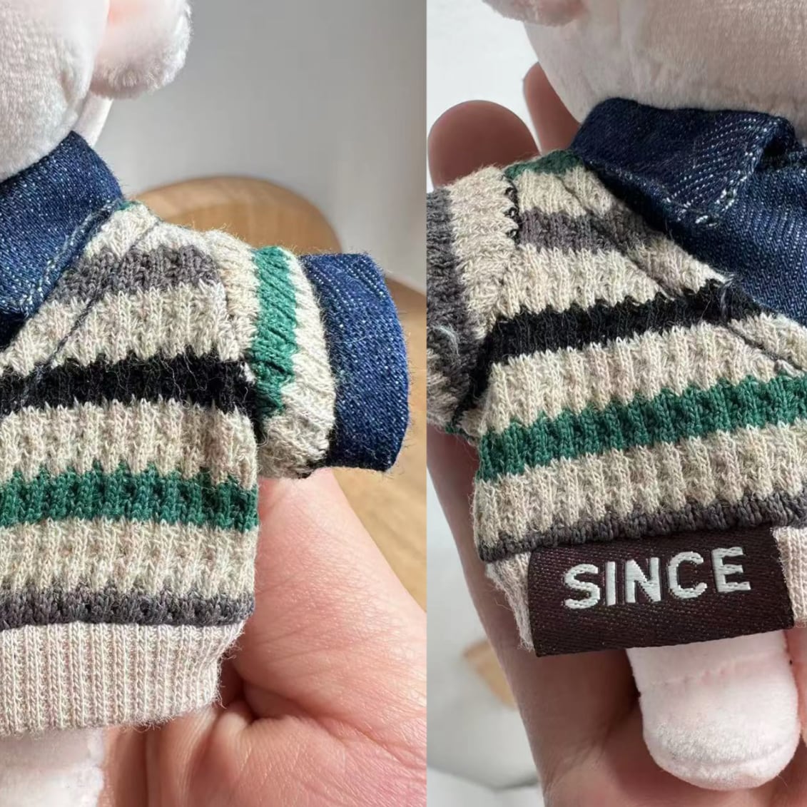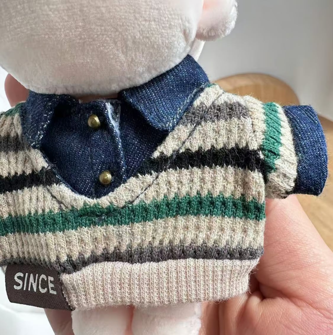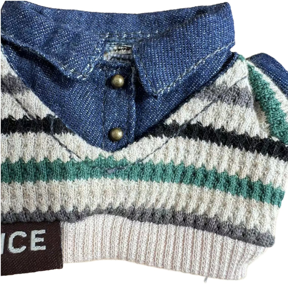 シャツとセーターを重ね着したような、おしゃれな「フェイクレイヤード」デザインのぬい服です。