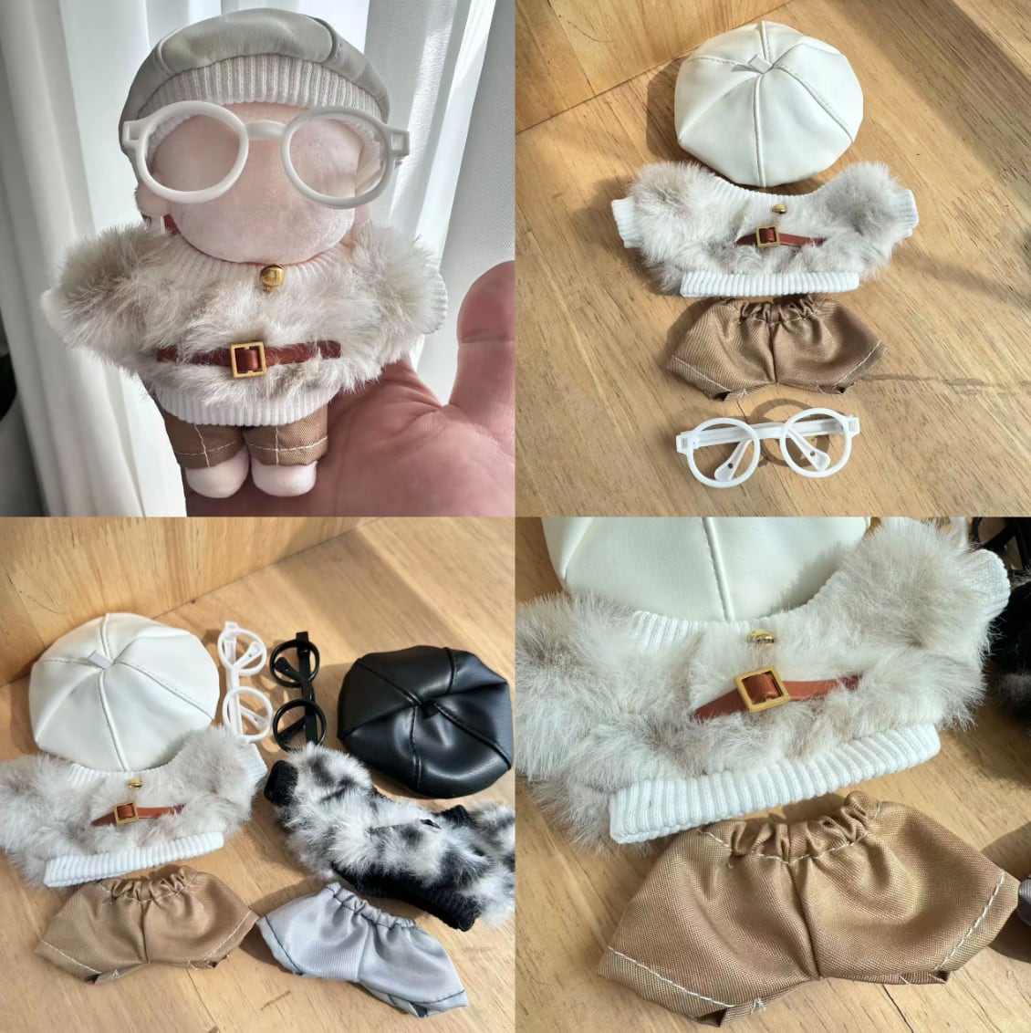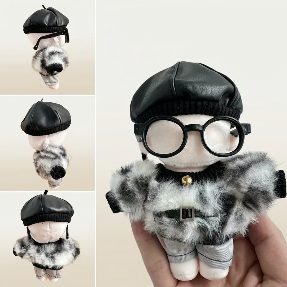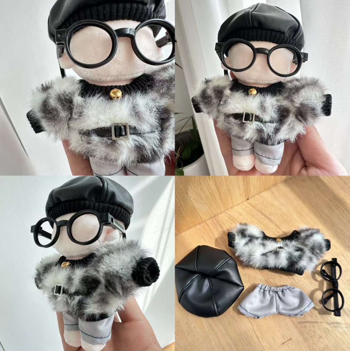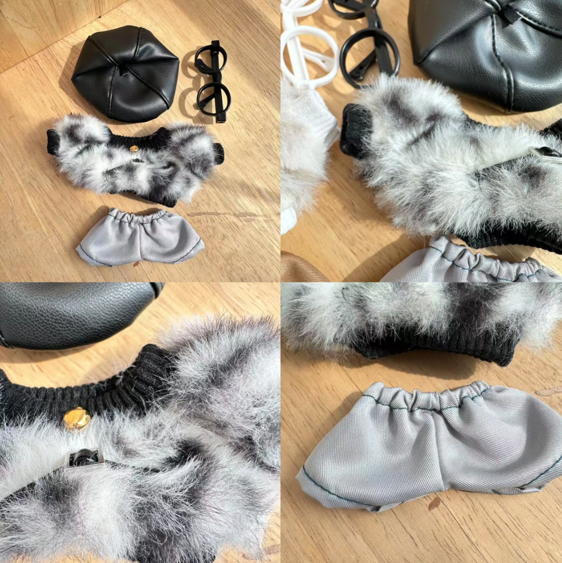 ボリュームのあるヒョウ柄ファーに、質感にこだわったフェイクレザーのベレー帽を合わせた、存在感抜群の「ぬい服」4点セットです。