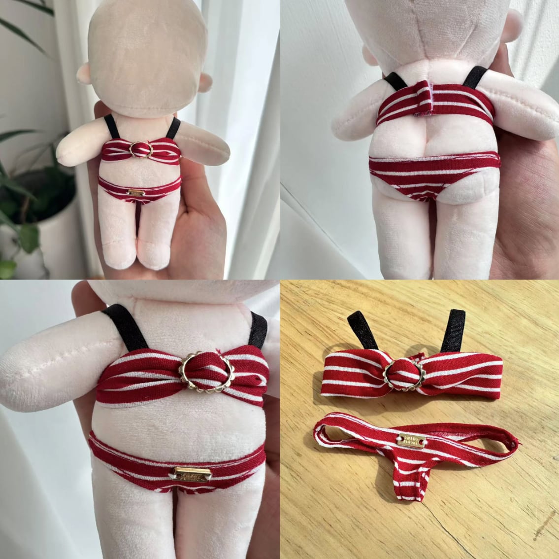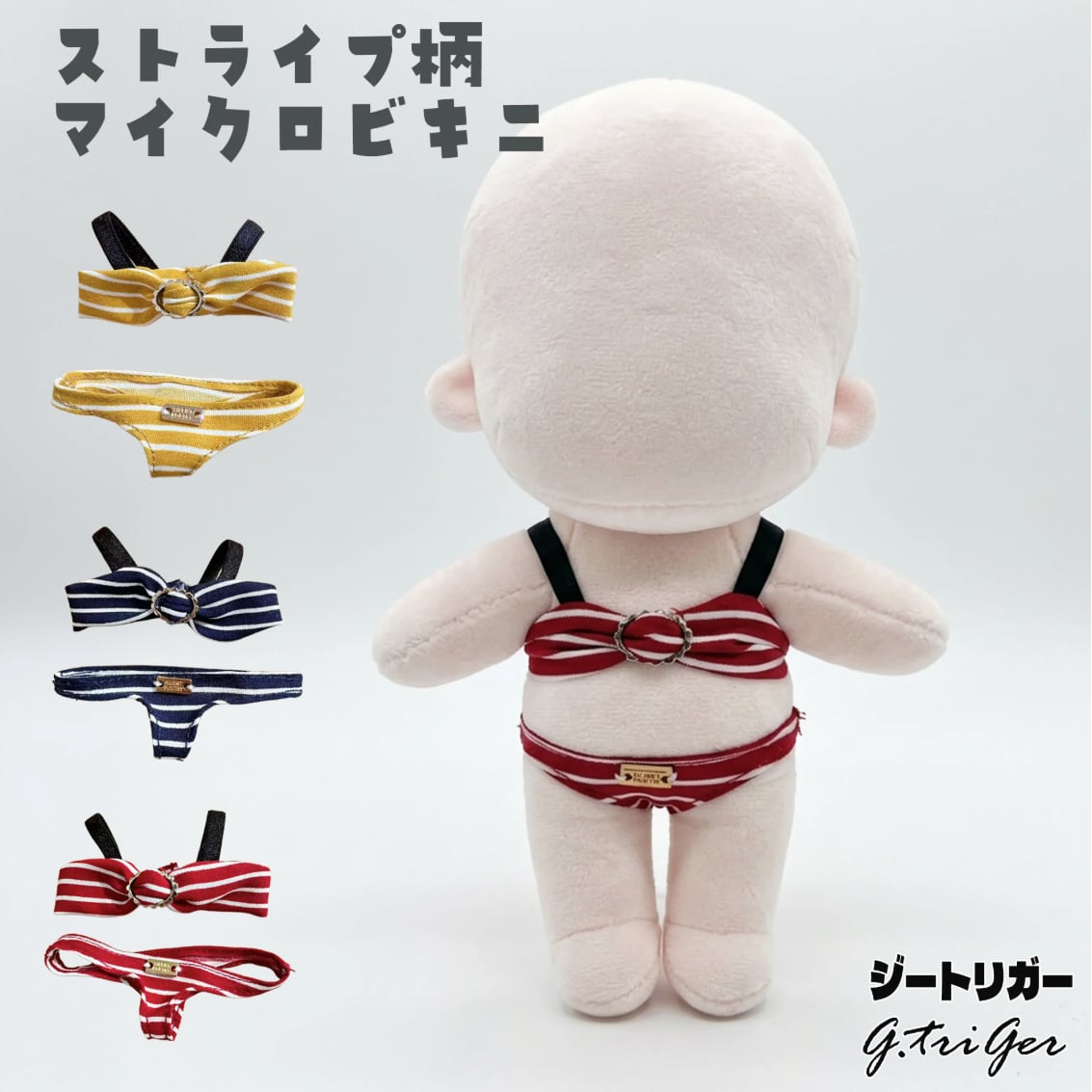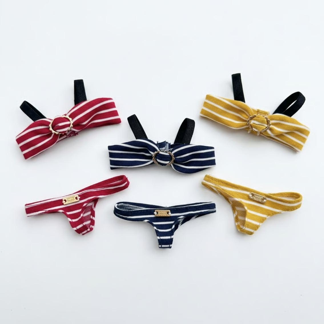 ヘルシーなボーダー柄と、胸元のリボンデザインが目を引くぬいぐるみ用ビキニセットが登場しました。