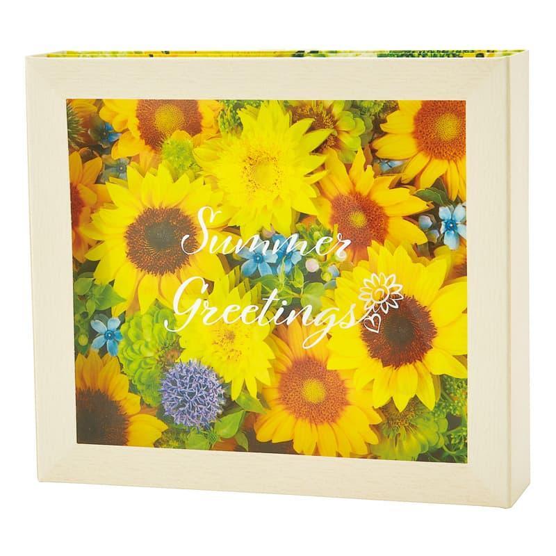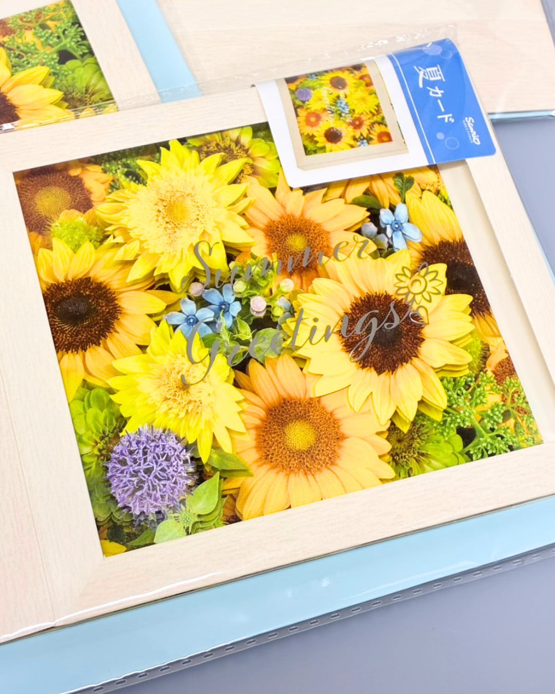 実際にヒマワリや小花を敷き詰めたアレンジメントを写真に撮り、3層に重ねて立体感を出した、フラワーボックスのようなカードです✨