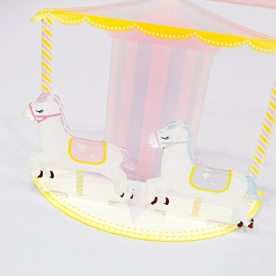 税込机の上に転がっている推しのケーブルマスコットをハグさせて可愛くディスプレイさせちゃおう!今回はゆめかわ風デザインのメリーゴーランドが登場!推しを木馬にハグさせて遊園地気分に!