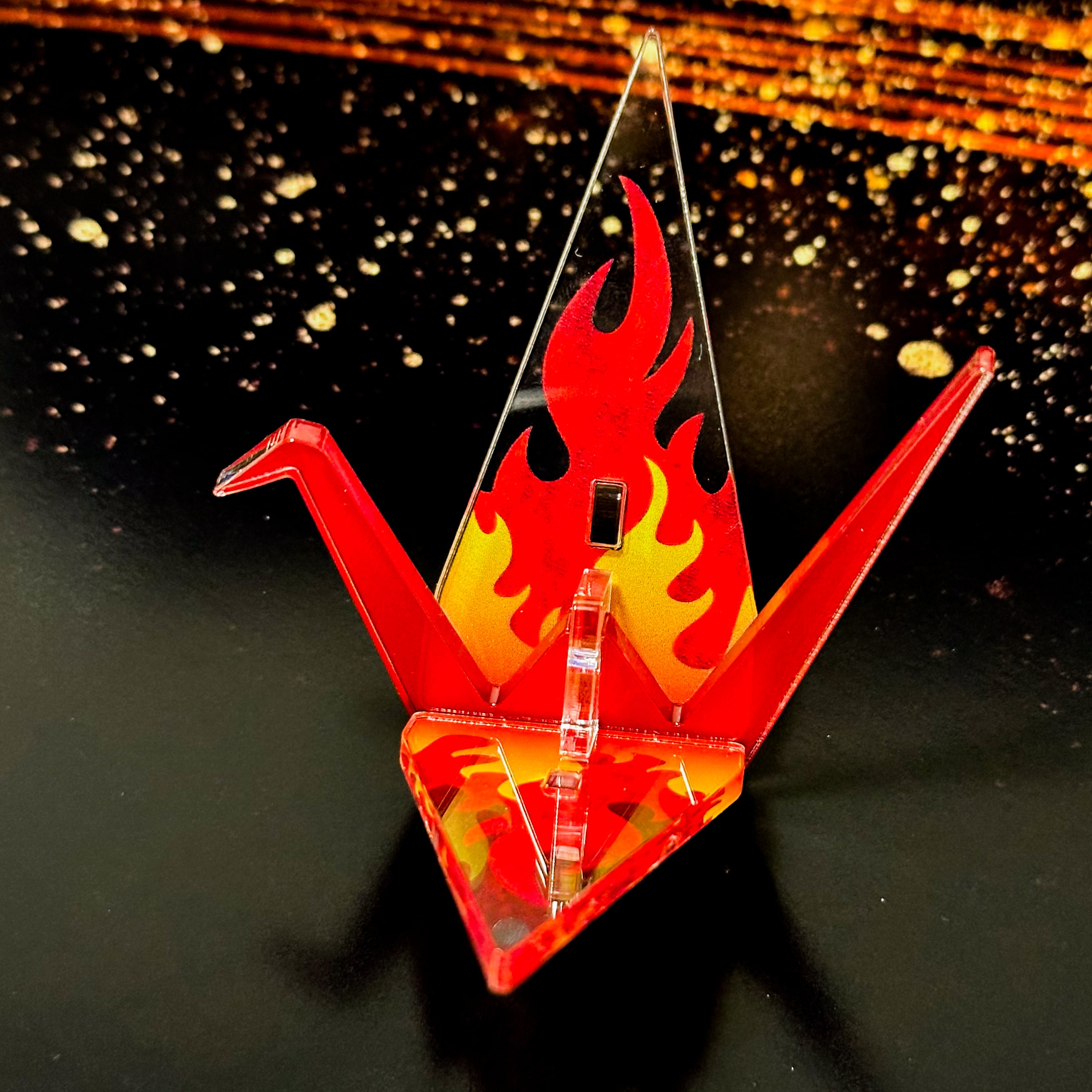 アクリル製なので「折る」ことは出来ないけれど、自分で「つくる」楽しみも感じられる簡単な組み立て式にしています。組み立てる前は一枚の板状になっているので、持ち運びにも邪魔になりません。紙の折り鶴も良いけれど、透明感と安定感の良さはアクリルならでは。ずっと手元に置いてもらえる、色褪せない、耐久性をテーマにしています。